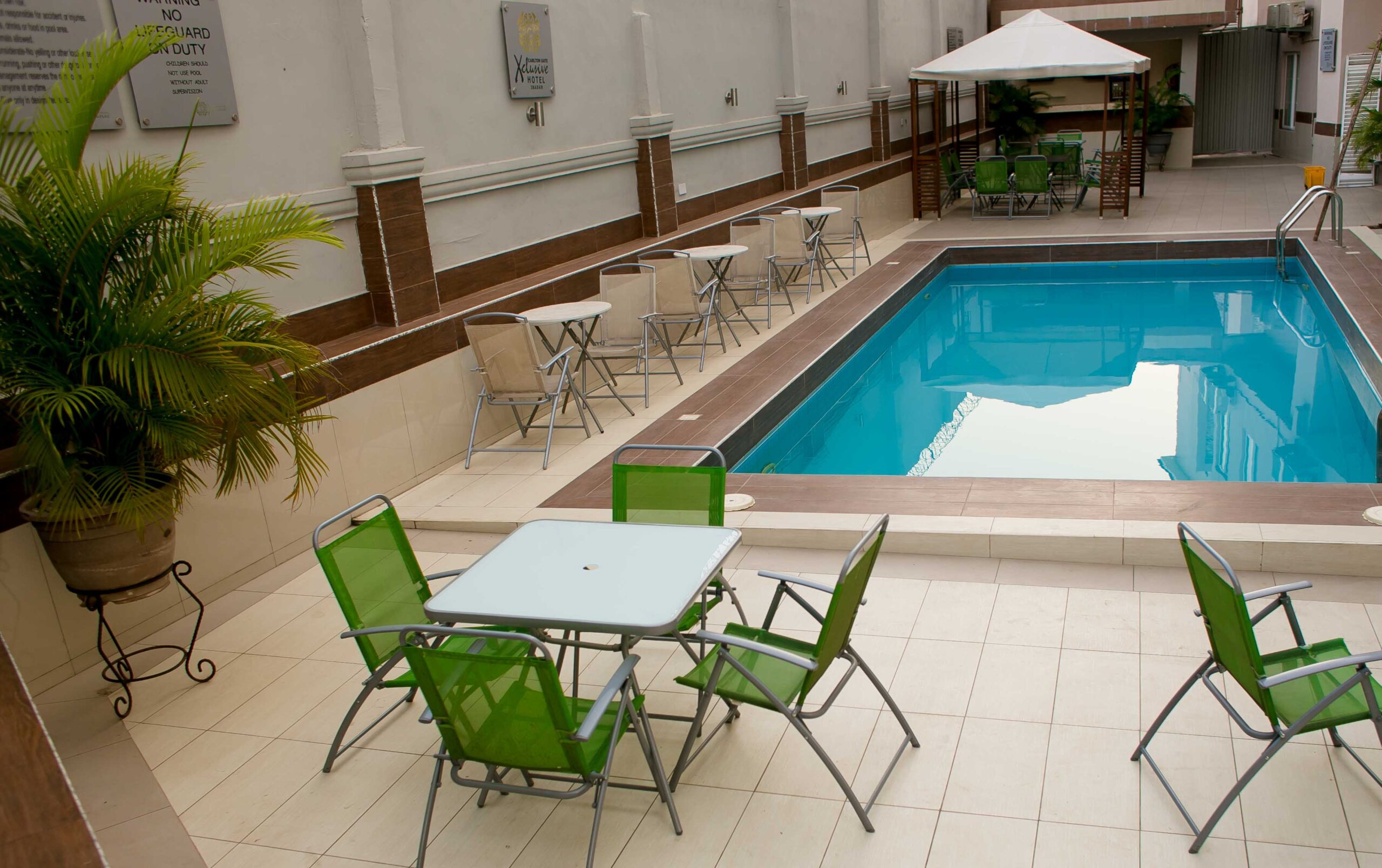 Carlton Exclusive Hotel enhances its excellent location with comprehensive amenities including a modern gym equipped with fitness facilities for health-conscious guests seeking to maintain exercise routines during their stay; a convenient elevator providing effortless access across multiple floors; a refreshing swimming pool offering recreational relaxation and respite from Ibadan’s warm climate; well-appointed bars serving quality beverages, cocktails, and light refreshments in comfortable social settings; and versatile event halls suitable for hosting weddings, conferences, seminars, corporate meetings, receptions, banquets, and social gatherings of various sizes.